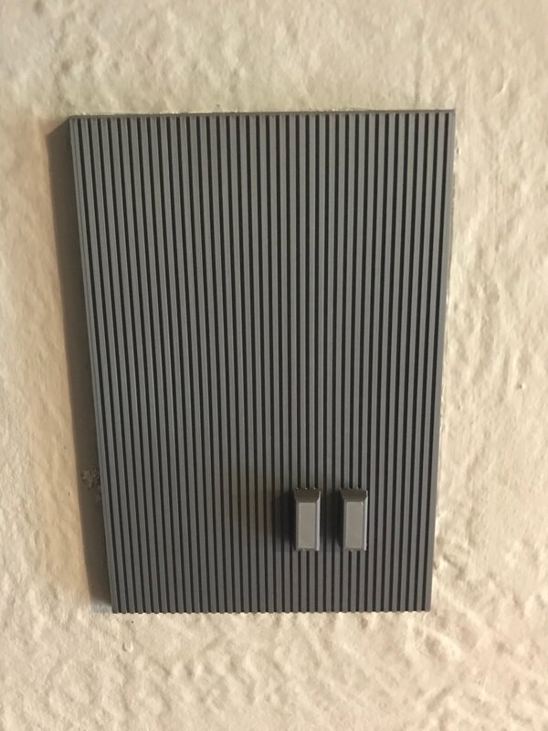 The final panel hides the front screw holes (my wife's idea) and echoes the original vertical slat pattern so it doesn't look out of place on the wall. I reprinted it in grey and added switch caps for a cleaner finish.